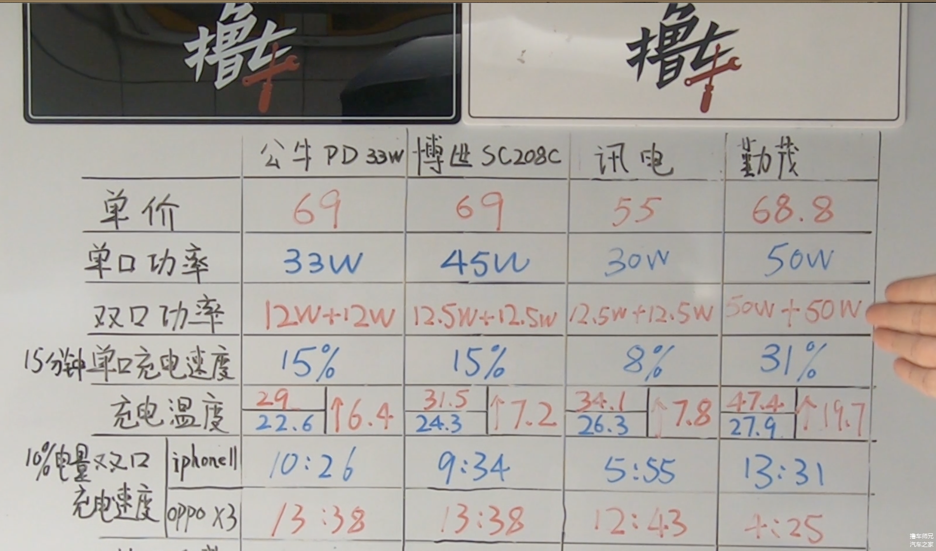 最差的是勤茂,它没有办法同时给两台不同的手机充电,而且它还有一个弊端,就是它是2个USB接口,所以它没有办法使用苹果的PD快充线,这个也是导致它本轮测试时间比较慢的原因之一。
