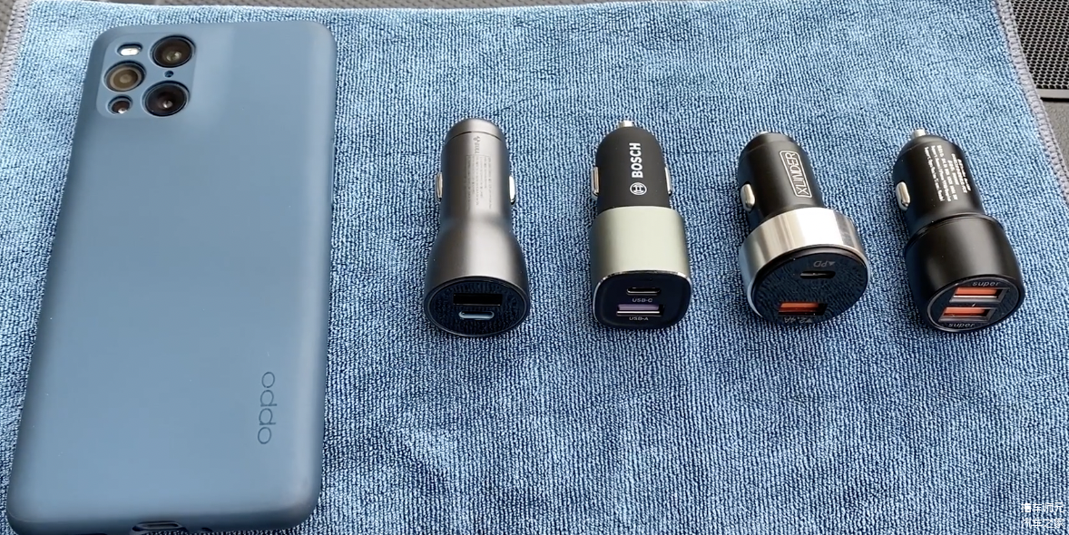 我会分别用这4款车载充电器,分别给支持最高65瓦充电功率的oppo find x3从50%的电量充电15分钟测试。