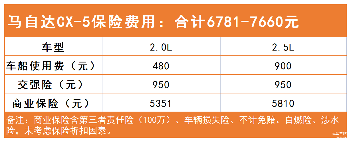 保险费用方面,车辆每年必缴的费用包含车船使用费、交强险和商业保险,马自达CX-5 2.0L车型的车船使用费为480元,2.5L车型的车船使用费为900元,两车型交强险均为950元,商业险部分我们选择了100万元的第三者责任险、车辆损失险、不计免赔、自燃险和涉水险,综合计算后得出第一年的保险总费用约为6781-7660元。