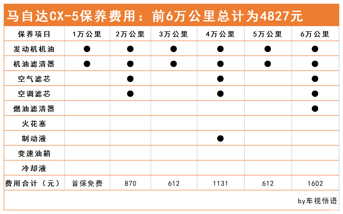 马自达CX-5的保养频率均为一万公里保养一次,首保免费的情况下,前6万公里的保养总费用在4827元左右,以每年2万公里的驾驶里程计算,每年保养费用约为1609元,如果购买了相应的保养套餐,保养费用还能有进一步下降的空间。