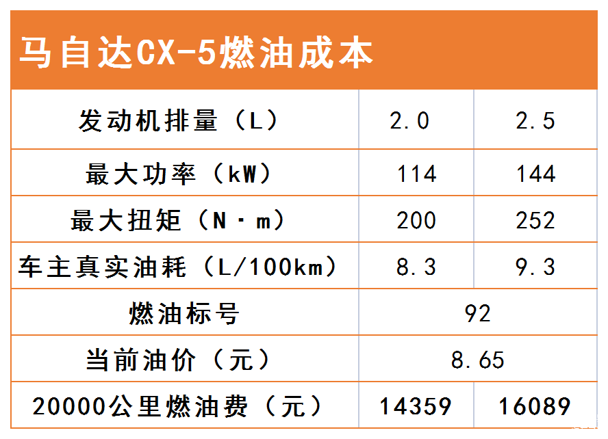 马自达CX-5提供2.0L和2.5L两种不同排量的发动机,我们根据老款CX-5车主的真实油耗来计算,结合北京92号汽油当前8.65元/L的价格,按每年2万公里里程计算,2.0L车型一年的燃油费用约为14359元,2.5L车型一年燃油费用约为16089元。当然,大部分实际油耗受驾驶习惯及实际路况的影响很大,因此这个费用还有一定的浮动空间,这里的数据只作为参考。