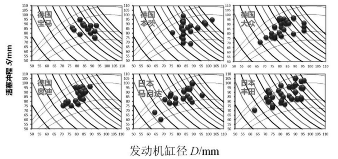 这里贴一个北京长城华冠汽车研发有限公司一篇文摘中整理的不同企业的缸径冲程排量汇总,特别有意思的几个现象,宝马最爱500cc的单缸排量,大多数机型都是单缸的模块化拓展;奔驰机型的缸径大多相同(近);马自达和丰田的数据则比较离散。大家可以看看迈锐宝XL这台2.0T落在哪个点上。