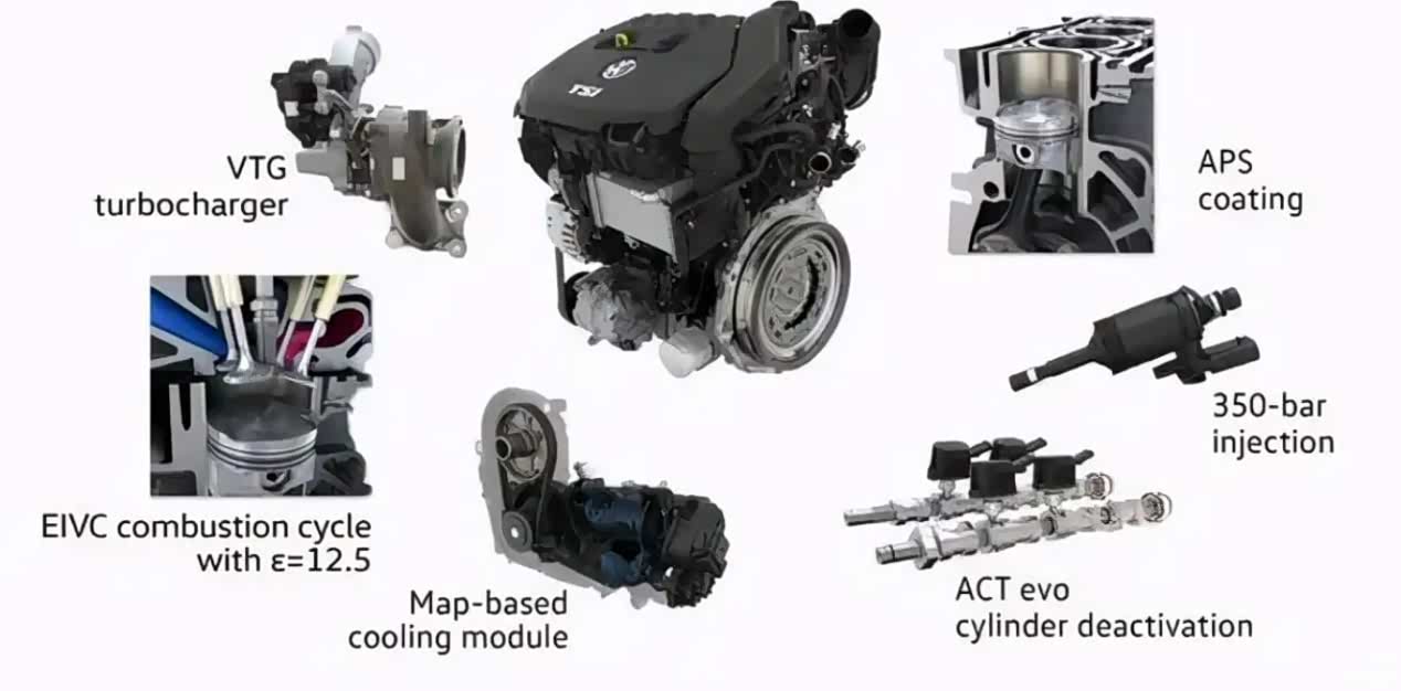 而在技术上,这款新发动机,相比此前的1.4T发动机,则拥有了更多先进的技术。比如,它搭载了可变截面涡轮技术(VTG)、高压缩比米勒循环技术(压缩比12.5:1),同时燃烧效率提升至37.5%。另外,高压共轨燃油喷射系统(压力达350Bar)、APS涂层等技术、气缸主打关闭技术、汽油颗粒物捕捉器等也有搭载。
