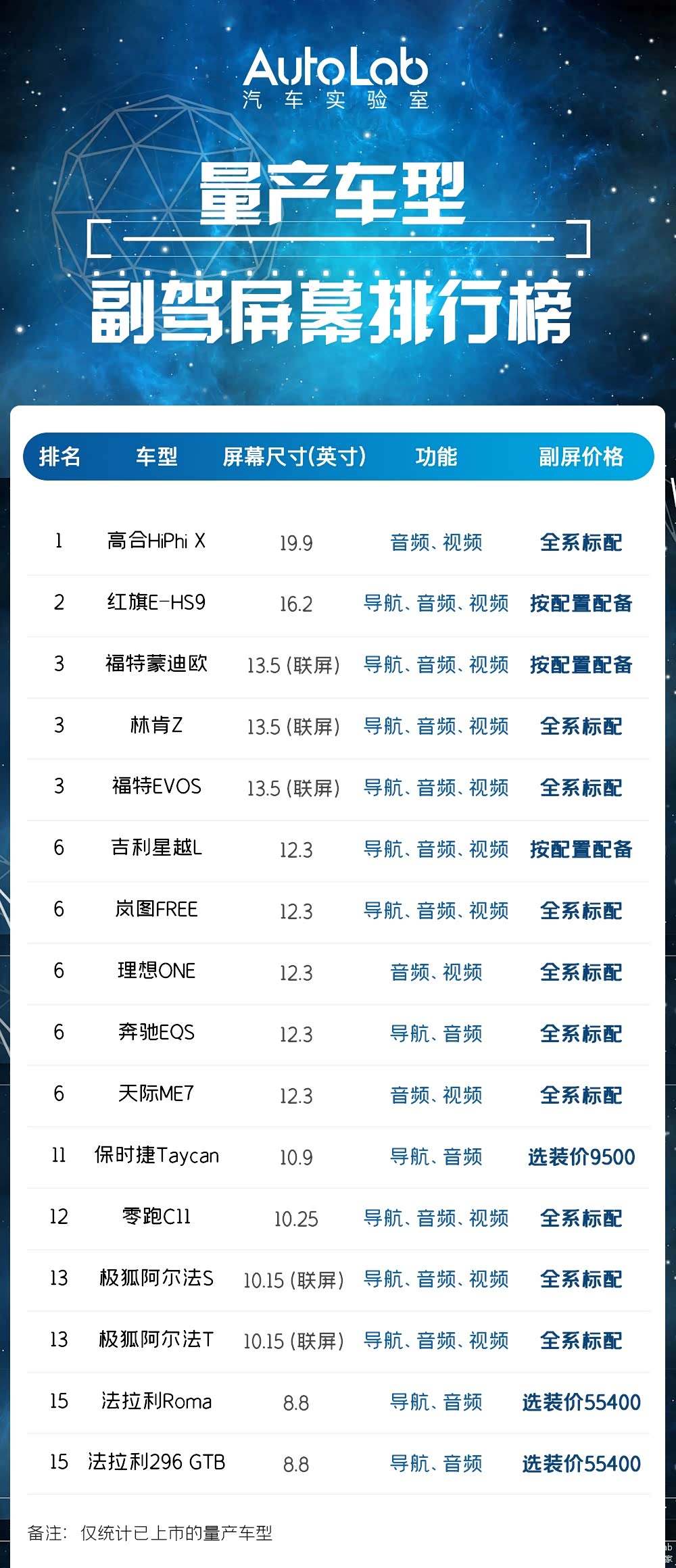 我开始和大家的想法还真差不多,总觉得副驾屏这个东西应该很多车型都有了吧。但是在统计了一圈目前已经上市的量产车后才发现,副驾屏幕其实真的很小众。