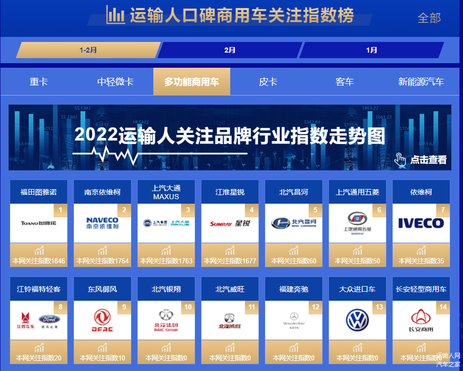 2022年2月运输人品牌指数榜中, 福田图雅诺(图片 | 参数 | 询价)、南京依维柯、上汽大通MAXUS、江淮星锐、江铃福特轻客的关注度同样位居前列。
