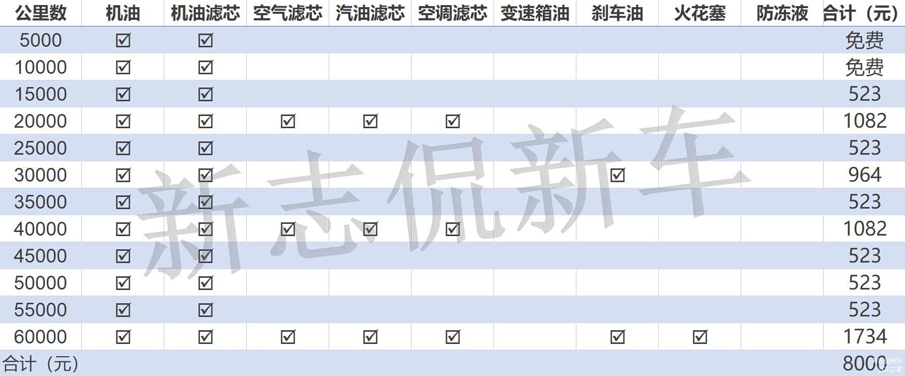保养部分,雪佛兰开拓者全系搭载2.0T发动机+48V电机的轻混系统,匹配9AT变速箱。保修期方面是三年或10万公里。这台车首次保养里程为5000公里,首次保养和二次保养免费,接下来每5000公里进行一次保养,开拓者的一次小保养的价格为523元【包括机油338元,机滤76元,工时费共180元】,最贵的一次保养出现在6万公里时,价格为1734元。