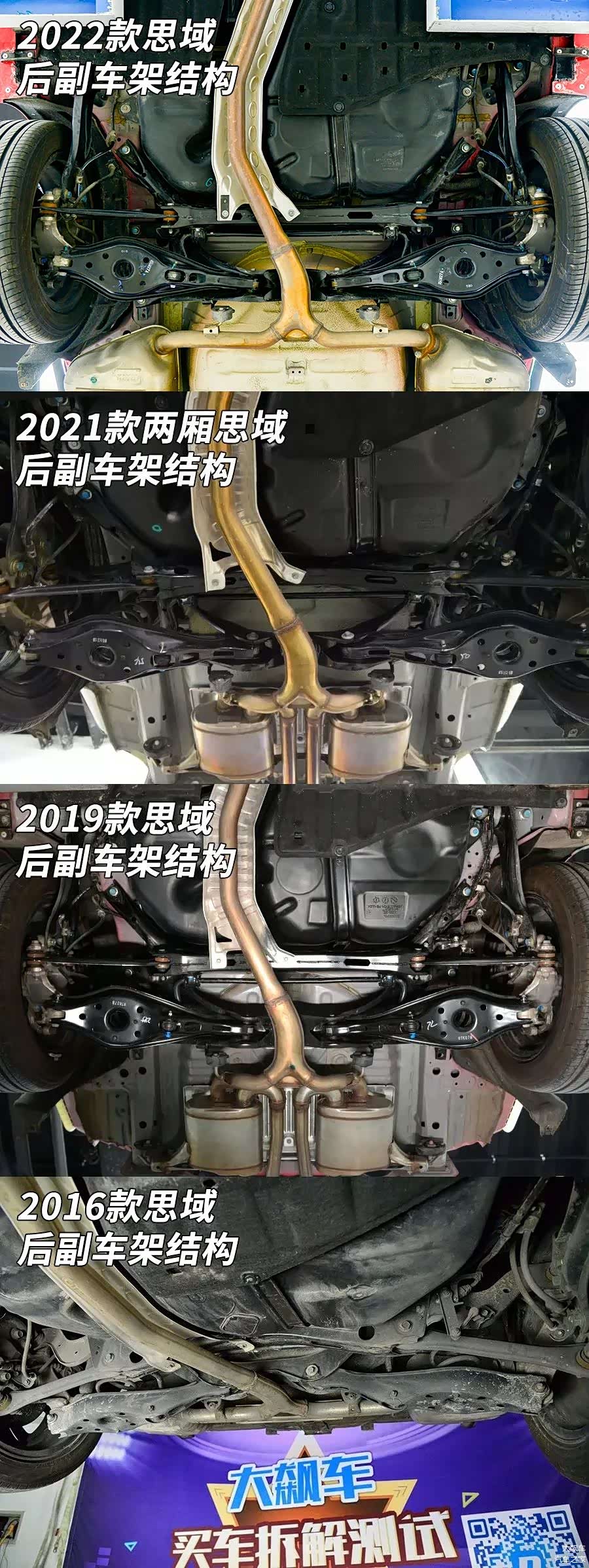 无一例外得到继承 这辆第十一代 本田思域(图片 | 参数 | 询价)的底盘基本上与之前几代思域没什么本质变化。依旧是H形前副车架配麦弗逊前悬,全框式后副车架配常见的“三横一纵”四连杆。无论是底盘隔热缺失,还是管线外露,没有树脂喷涂,甚至是新车底盘生锈等诸多问题,在十一代思域身上无一例外都得到了“继承”。 那么关于这辆车的内饰又会如何,这辆全新一代思域值不值得买呢?还请继续关注后续的拆车内容。(本文及视频中的测量数据结论观点仅对此辆车负责,测量数据对公示的实验方法负责。)