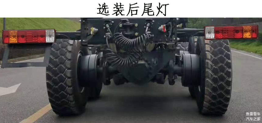 这张后尾灯选装图就更为清晰了,技术灵魂就是体现在中央脊管式车架和摆动半轴部分,特殊的结构设计能允许车轴大角度摆动,时刻保证车轮贴地;里面是整个传动系,完全与外界隔离,不怕泥水、无惧磕碰,扭杆弹簧或者空气弹簧,每个车轮都是独立悬挂(也就是前面提及的摆动式半轴),上下活动空间巨大。