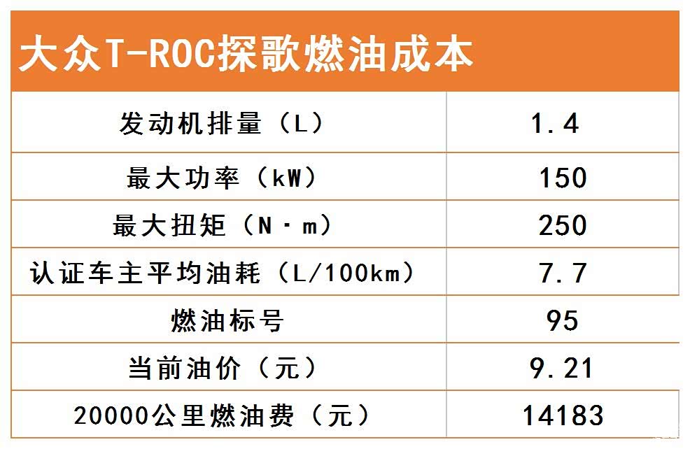 大众T-ROC探歌搭载1.4T涡轮增压发动机,我们根据认证车主百公里7.7L的平均油耗为基准,结合北京95号汽油当前9.21元/L的价格,按每年2万公里里程计算,一年的燃油费用约为14183元。当然,大部分实际油耗受驾驶习惯及实际路况的影响很大,因此这个费用还有一定的浮动空间,这里的数据只作为参考。