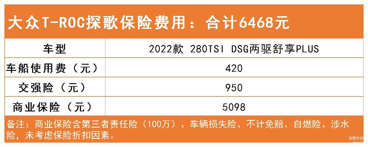 保险费用方面,车辆每年必缴的费用包含车船使用费、交强险和商业保险,一汽大众T-ROC探歌的车船使用费为420元,交强险为950元,商业险部分我们选择了100万元的第三者责任险、车辆损失险、不计免赔、自燃险和涉水险,商业保险的费用为5098元,综合计算后得出第一年的保险总费用约为6468元。