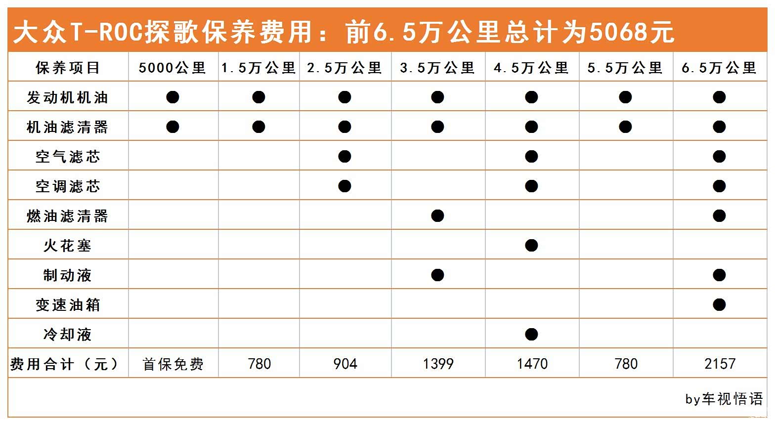 大众 T-ROC探歌的保养频率均为1万公里保养一次,首保免费的情况下,前6.5万公里的保养总费用在5068元左右,以每年2万公里的驾驶里程计算,每年保养费用约为1689元,如果购买了相应的保养套餐,保养费用还能有进一步下降的空间。