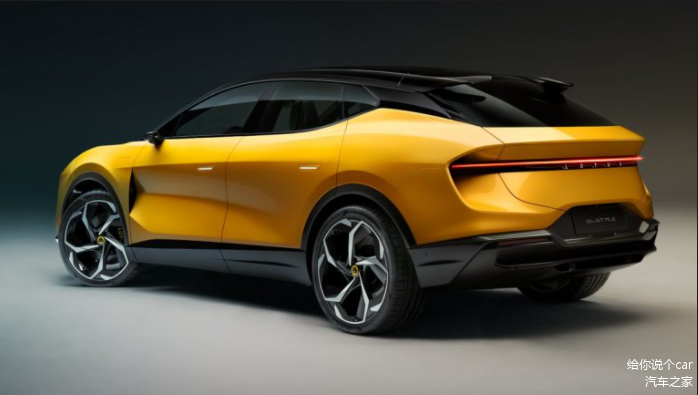 外观延续Evija设计风格,具有符合新世代家族设计语言的头灯设计,搭配面积宽大的前气坝设计,还有整合空力导流孔道的前舱盖、宽体暴龟前后轮拱、低斜车顶等元素,如果只看腰线以上,Eletre根本就是一辆四门跑车体态。只是为了创造更多空间机能,也迎合SUV买家需求。Lotus设计师拉高底盘离地高度,并且加厚车门面积,将跑车线条与SUV机能融合。