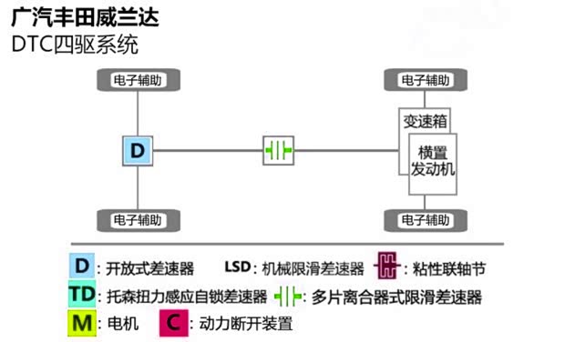 威兰达DTC智能四驱系统和大部分城市SUV配置的四驱系统差不多,通过中央差速器内的多片离合的限滑差速器实现前后轴的动力分配。可以实现前后100:0或者50:50的动力分配,在日常平稳路况,以前驱行驶,提高燃油经济性。在面对恶劣路况的时候,多片离合器可以在几十毫秒完成结合,把来自中央传动轴的动力分配到后轮上,实现快速脱困。