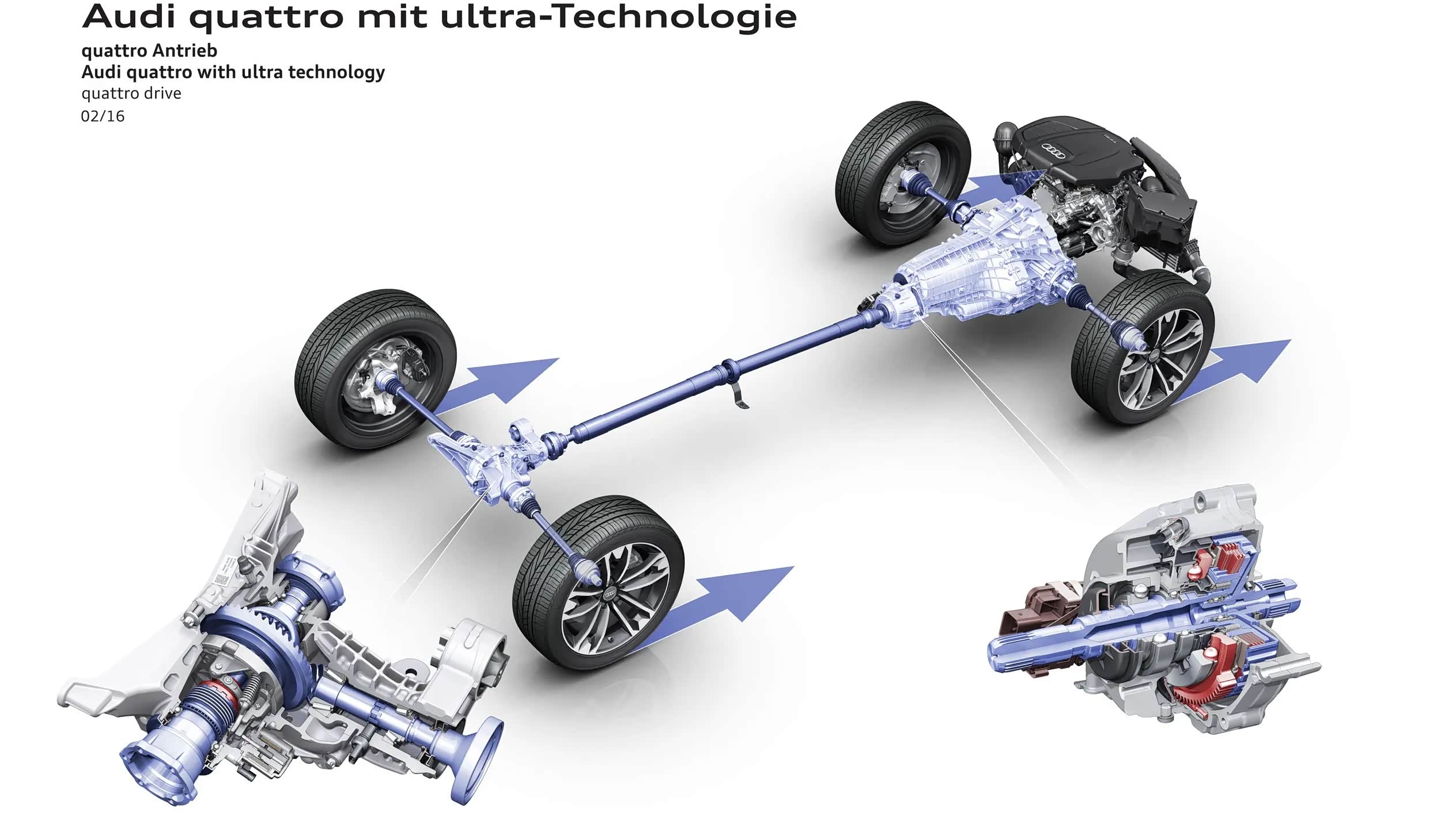 我们先来讲结构。即便ultra quattro是多片式离合器的电控适时四驱,但是ultra quattro在普通的电控多片离合结构上做了2个方面的改进:分别是高效驱动和四驱的迅速切换。它的基础结构也其他适时四驱相似,通过多片离合器式中央差速器来控制两驱和四驱的切换,在行驶路况较好时,车辆会断开中央的离合器片以前驱模式行驶,当车辆遇到积水或者沙地路面时,中央差速器多片离合器结合,切换为四驱从而快速脱困。不过,要做到更为高效的四驱,ultra quattro的方案并不是像瀚德那样将多片式离合器放置于车辆后桥前,它的多片式离合器就在变速箱输出轴后方,和老款Q5quattro托森机械式中差的放置位置差不多。