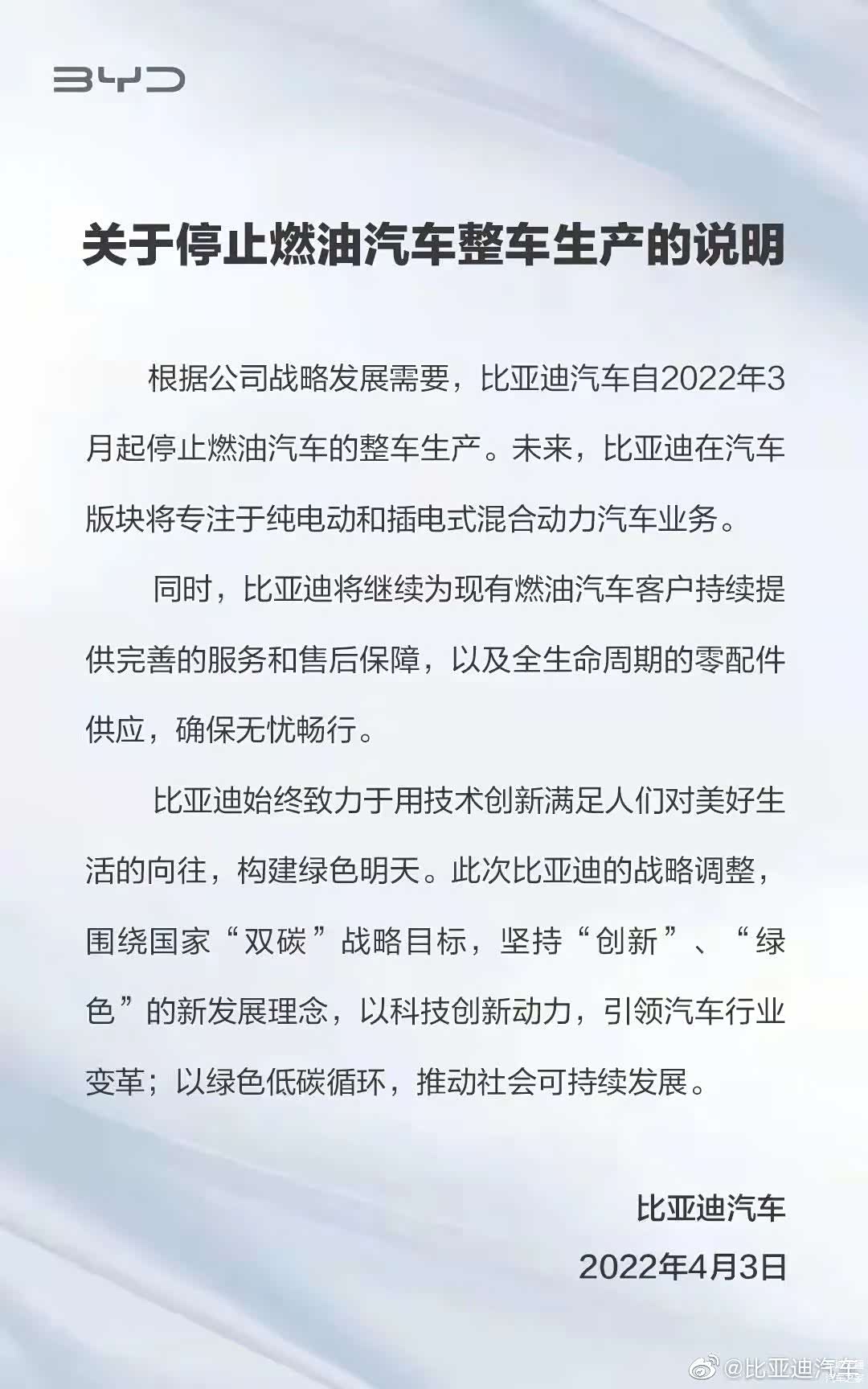就在这样的大环境下,比亚迪通过官方渠道放出了一个“王炸”——自2022年3月起停止燃油汽车的整车生产。未来,比亚迪在汽车板块,将会专注于纯电动和插电式混合动力汽车。