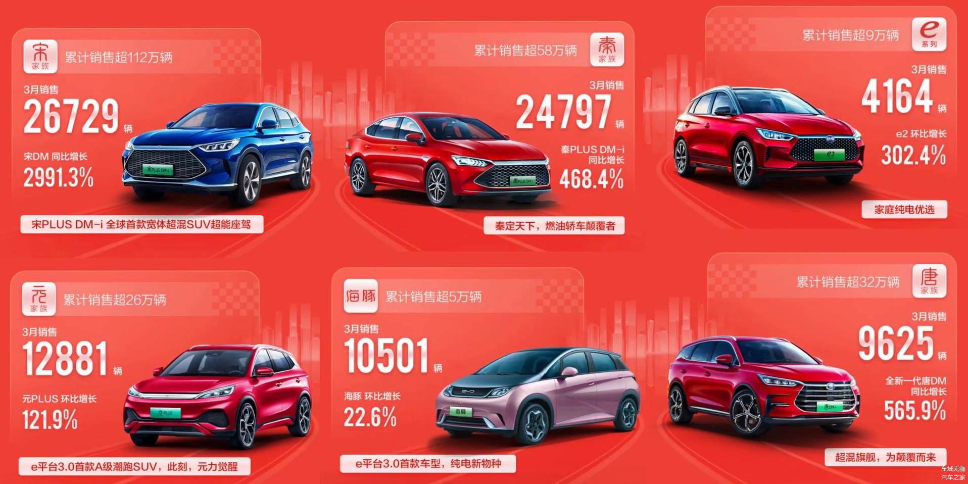 而且,从比亚迪公布的3月销量来看,新能源车型单月累计销量已超10万大关,其中宋、秦家族贡献超2万辆,元、汉、海豚超万辆,唐系列9千多,e网也有近5千进账。