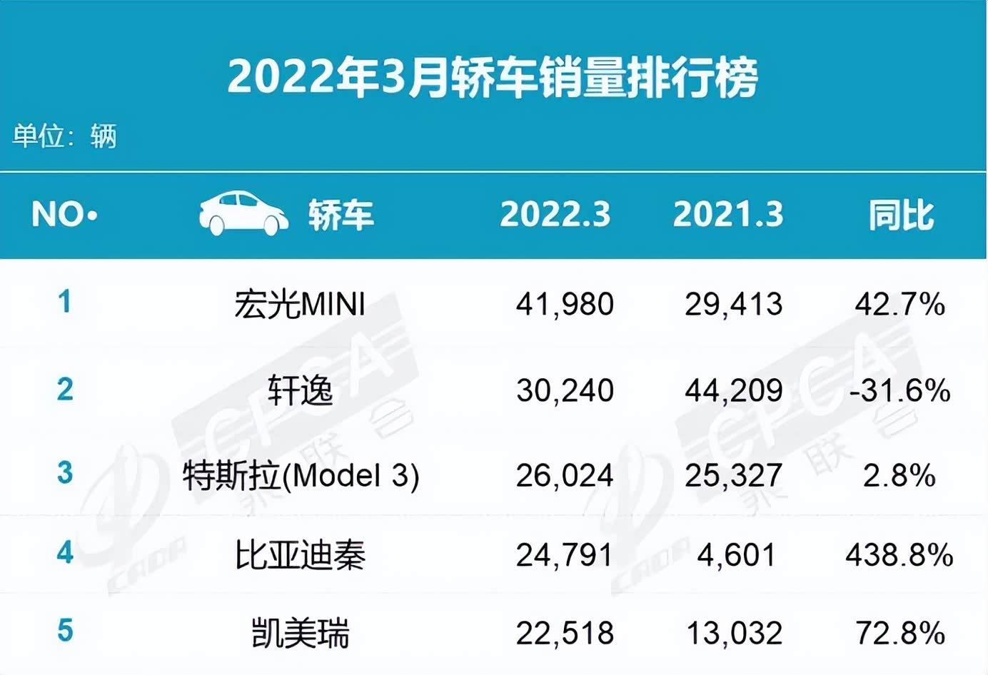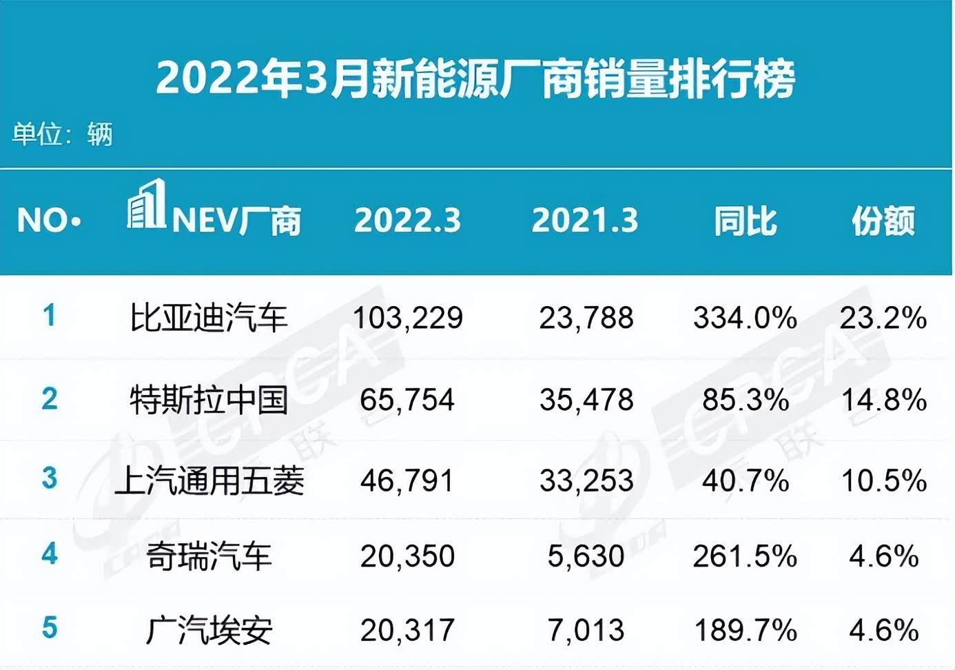 2022年3月份,比亚迪新能源车型销量为103229辆,燃油车销量为0,这是人类历史上第一个单月销量破10万的新能源汽车厂商。从乘联会发布的数据来看,3月份比亚迪超越了吉利、长城等国产巨头,销量仅次于一汽大众和长安汽车。但比亚迪的增长率是长安汽车的将近10倍,成为国产销冠已经是不可逆转的了。