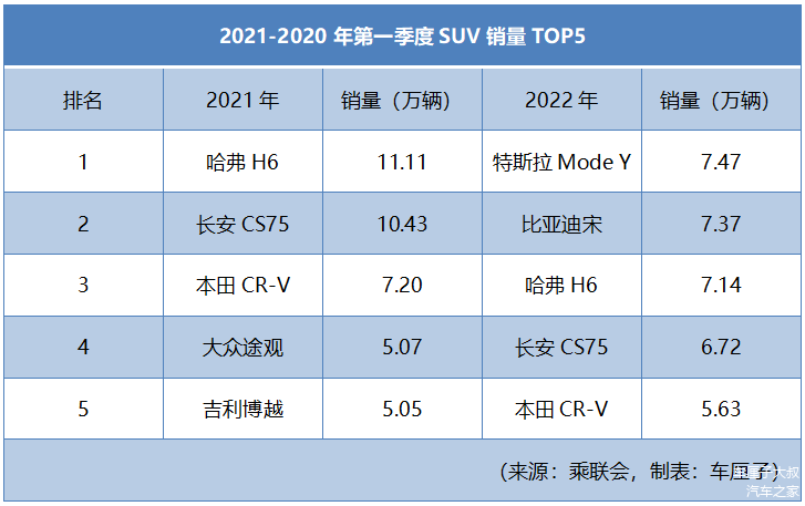 更“有趣”的是,如果对比2021-2022年第一季度的轿车、SUV榜单,新人换旧人的速度更惊人:轩逸、新朗逸、哈弗H6、长安CS75等头部燃油“走量大户”,今年开局销量都有不同程度的下滑,而宏光MINI、比亚迪秦/宋两台DM-i车型,Model Y则坐稳榜单,实现新一轮“新老更替”。至于卡罗拉、思域、途观等以往坐稳TOP 10的经典车型,也被帝豪、长安CS55、奔驰GLC、宝马X3等以往表现一直不俗的车型超越。
