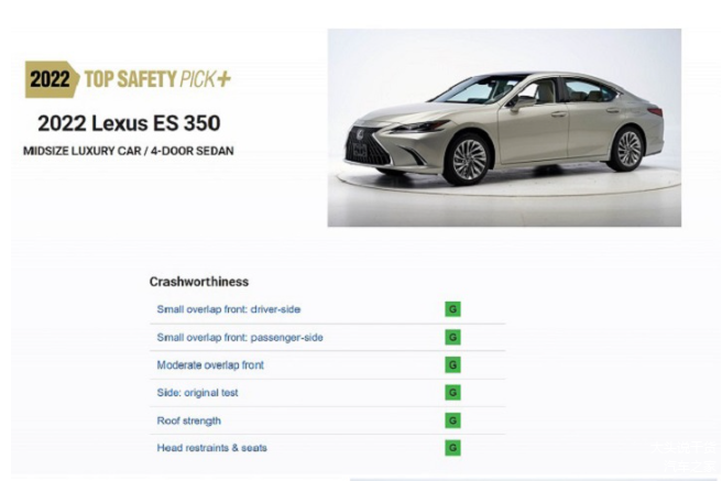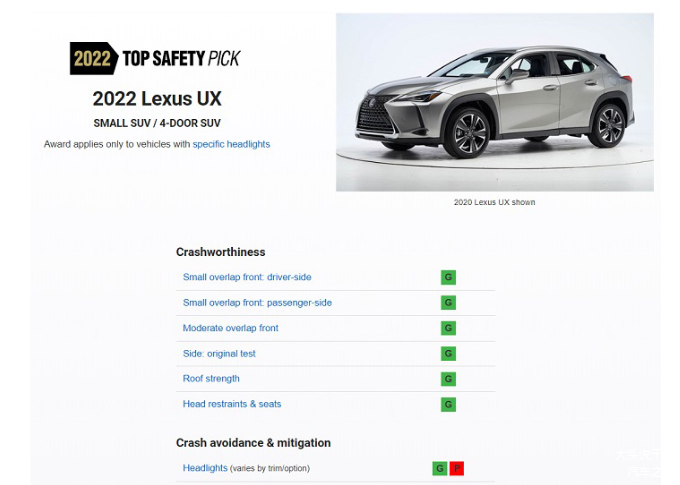除此之外,IIHS还发布了美规版雷克萨斯ES、IS、UX和RX等车型的碰撞安全测试结果,其中,美规版雷克萨斯ES也是连续4年获得Top Safety Pick +评级;美规版雷克萨斯IS也是连续2年获得Top Safety Pick +评级;美规版雷克萨斯UX和RX车型,由于头灯组没有达到好或者可接受的评价,因此只获得了Top Safety Pick评级。