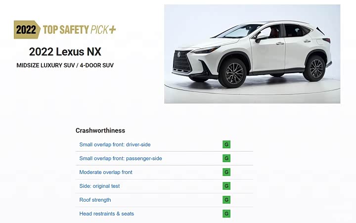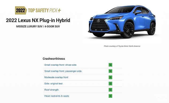 美国高速公路安全保险协会(IIHS)每年都会对在美国销售的新车进行碰撞安全测试,并给出相应的安全评级。日前,IIHS发布了第二代美规版雷克萨斯NX车型碰撞安全测试结果,其成绩为Top Safety Pick+(最佳安全)。据悉,这是继去年之后,雷克萨斯NX车型再次获得Top Safety Pick+评级,已经连续4年荣膺这一殊荣;同时首次参与碰撞安全测试的雷克萨斯NX车型插混动力车型也同样取得不错的成绩。