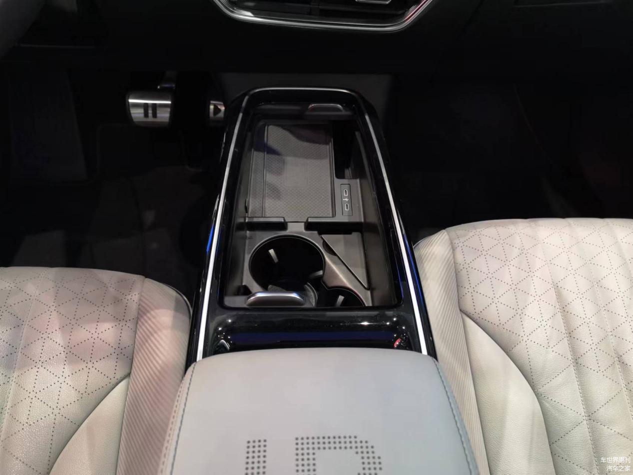 中央通道区域,打开以后内部分区看起来要比ID.3复杂不少,同样设计有大小、造型不同的储物空间,可以摆放水杯、日常杂物等,实际使用起来比较便捷。