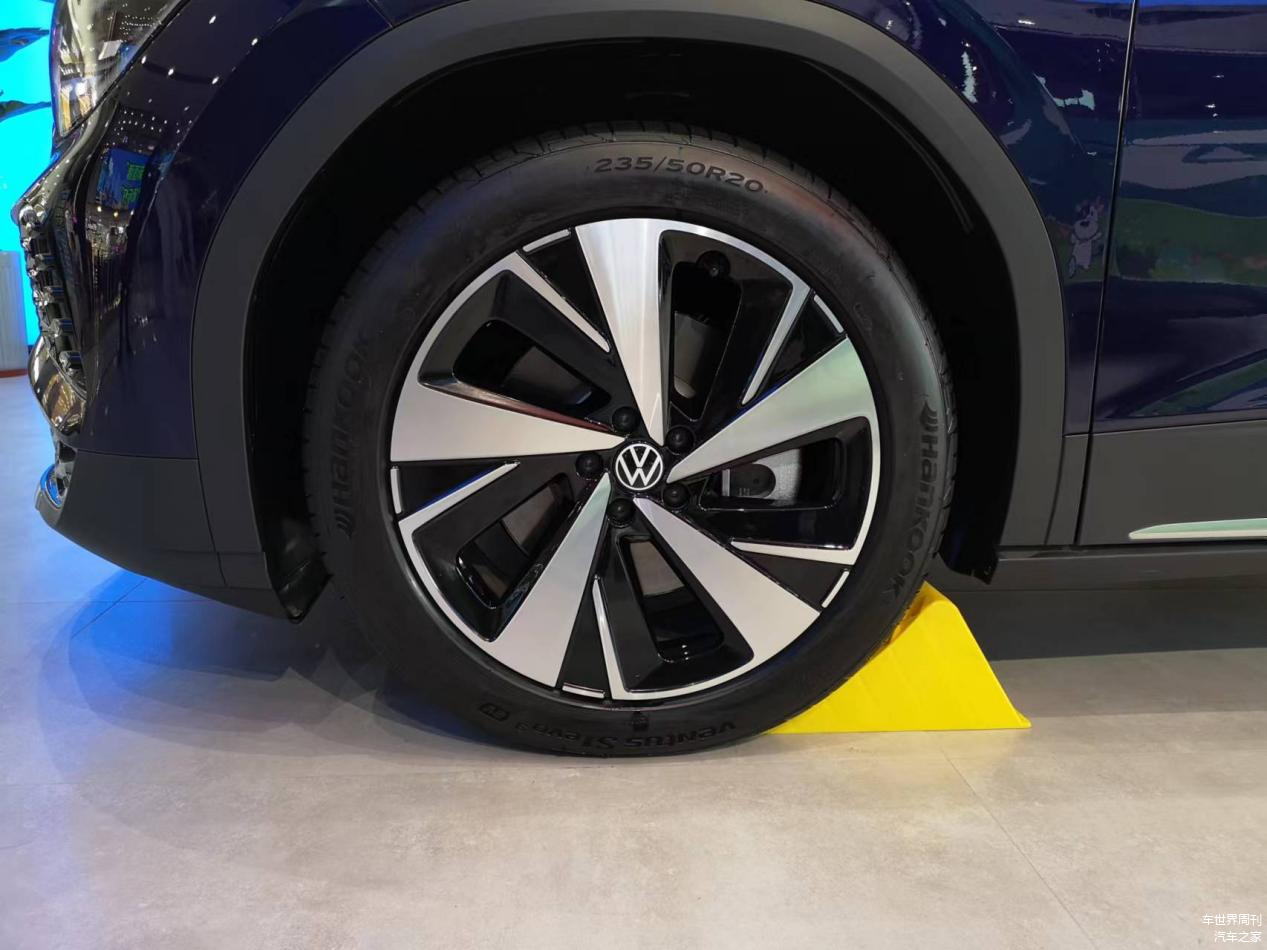 车身下方,ID.6 X实拍车型匹配的是20英寸双色轮毂,造型动感,质感也非常不错。相比此前我们拍到的ID.3的轮毂造型显得更加大气,接受度更高一些。