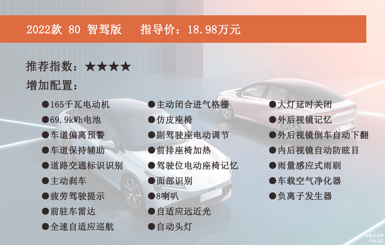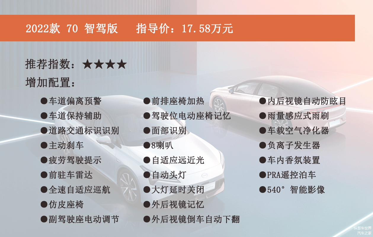 80智驾版比70行政版贵5000元,除了动力和续航里程的优势,配置上也丰富了不少。不过这两个版本不在一个水平线上,那么它和80科技版相比,价格高了1.4万元,配置上多了疲劳驾驶提示、前驻车雷达、自动泊车入位、主动闭合式进气格栅、副驾驶座电动调节、前排座椅加热、面部识别、8喇叭、车载空气净化器、负离子发生器、车内香氛装置、遥控泊车、透明底盘等,整体的配置水平和70智驾版非常接近(多了主动闭合式进气格栅),所以推荐度也和70智驾版相同。