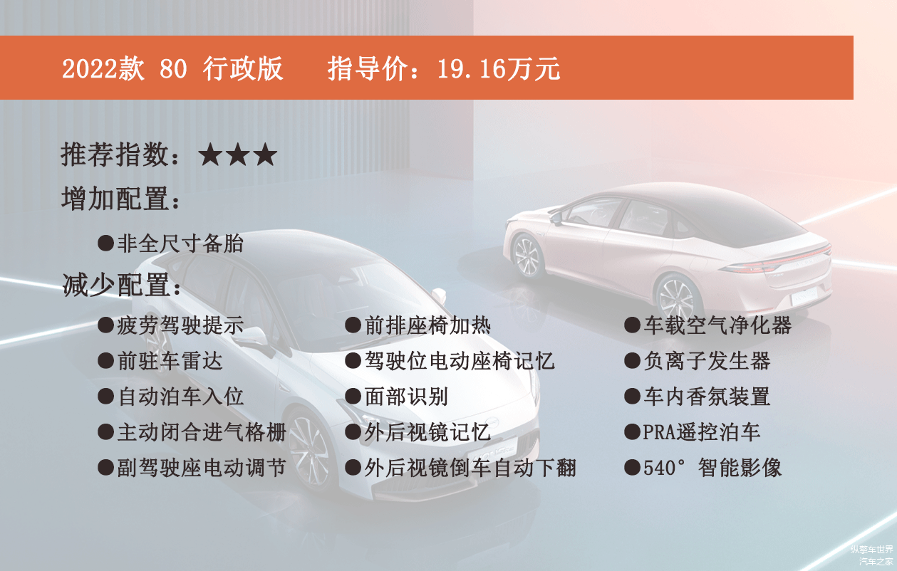 80行政版在价格上比80智驾版高了1800元,多了非全尺寸备胎,少了疲劳驾驶提升、前排座椅加热、自动泊车入位等功能,基础功能比较齐全,动力和续航里程也优于70行政版,因此相对来说80行政版较70行政版的推荐度高一些。