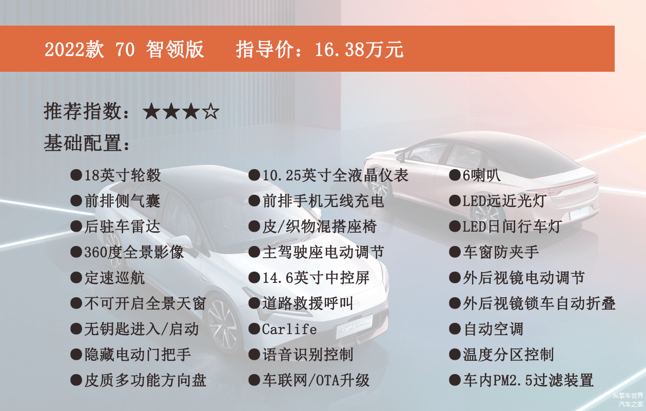 入门级的70智领版标配了360度全景影像、定速巡航、不可开启全景天窗、无钥匙进入、10.25英寸全液晶仪表、14.6英寸中控屏、Carlife、车联网、OTA升级、自动空调等功能,基础配置还是很完善的,略显遗憾的就是缺少了一些驾驶辅助功能和舒适配置,如果你不追求太高的配置,选择这款入门级版本就能满足大部分的用车需要了。