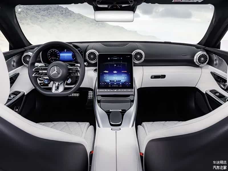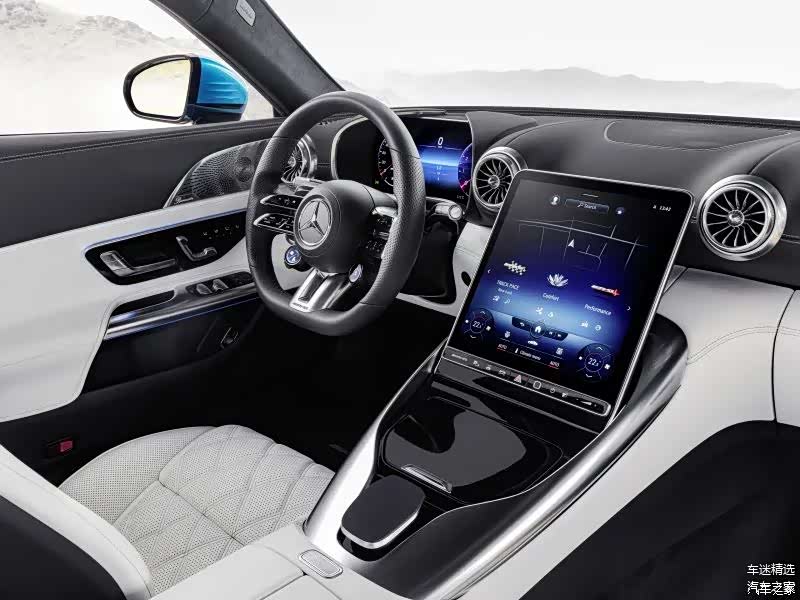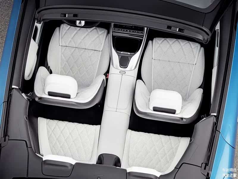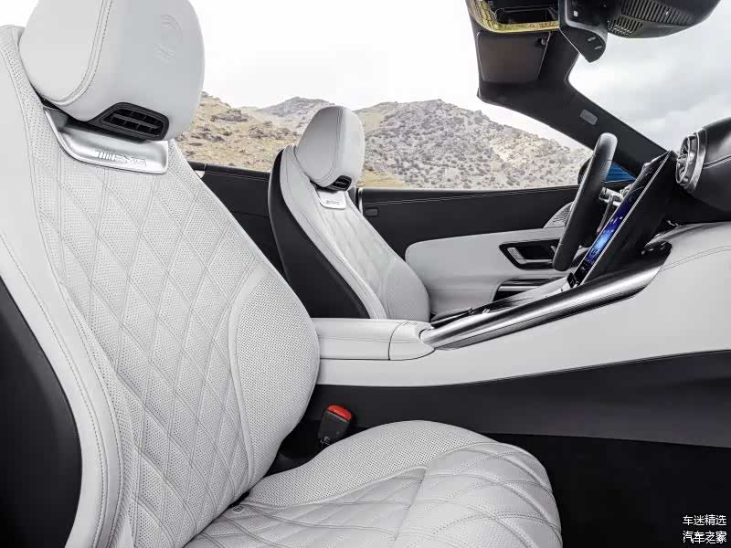 被白色皮革包裹的座椅不仅有菱形纹理,还有AMG标识和颈部暖风功能,后者可以算是敞篷车型独有的贴心配置。功能方面,前排座椅配备加热、通风、位置记忆功能。