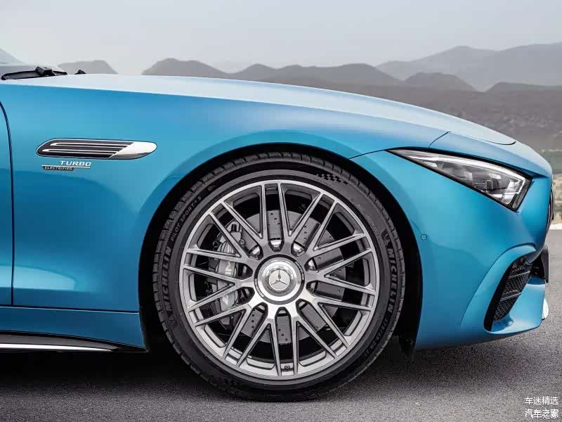 饱满是侧面的基调,再加上长车头的设计,视觉效果优雅又时尚。门把手采用隐藏式设计,前翼子板的黑银双色装饰下方还有TURBO ELECTRIFIED字样,在两款V8车型上这里是V8 BITURBO 4MATIC+标识。
