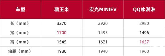 车身尺寸方面,新车长宽高分别为3270*1700*1545mm,轴距为1980mm,相比竞品车型宏光MINIEV、QQ冰淇淋,糯玉米在长度、宽度和轴距方面优势明显,3270mm的车身长度甚至比奇瑞小蚂蚁还要多出70mm,预计会带来更好的乘坐空间体验。