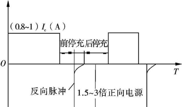脉冲快速充电必须用脉冲快速充电机进行,其充电电流波形如图1-16所示。脉冲快速充电的过程是:先用额定容量的80%~100%的大电流进行定流充电,使蓄电池在短时间内充至额定容量的50%~60%。当单格电池电压升至2.4V,开始冒气泡时,由充电机的控制电路自动控制,开始脉冲快速充电,首先停止充电25ms(称为前停充),接着放电或反向充电,使蓄电池反向通过一个较大的脉冲电流(脉冲深度一般为充电电流的1.5 ~3倍,脉冲宽度为150~1000μs),然后再停止充电40ms(称为后停充),以后的过程为正脉冲充电前停充负脉冲瞬间放电后停充正脉冲充电……此过程循环进行,直至充足电。