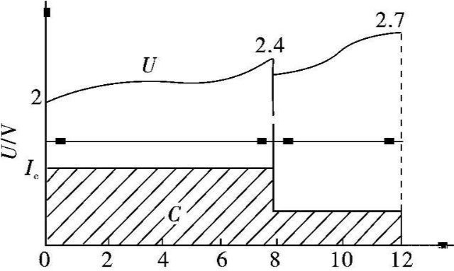 为缩短充电时间,充电过程通常分为两个阶段,第一阶段采用较大的充电电流,使蓄电池的容量得到迅速恢复。当蓄电池电量基本充足,单格电池电压达到2.4V,开始电解水产生气泡时,转入第二阶段,将充电电流减小一半,直到电解液密度和蓄电池端电压达到最大值且在2~3h内不再上升,蓄电池内部剧烈冒出气泡时为止。