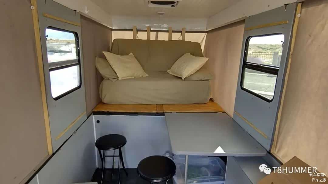怎么在车上生活?从图上我们可以看到,一张大床几乎占据了整个房车里的空间。这是过夜时的状态。这张床收起来可以成为一张舒服的沙发,于是房车里还有放小茶几的位置,甚至还能有厨房的区域。除了麻烦点儿,没什么毛病。