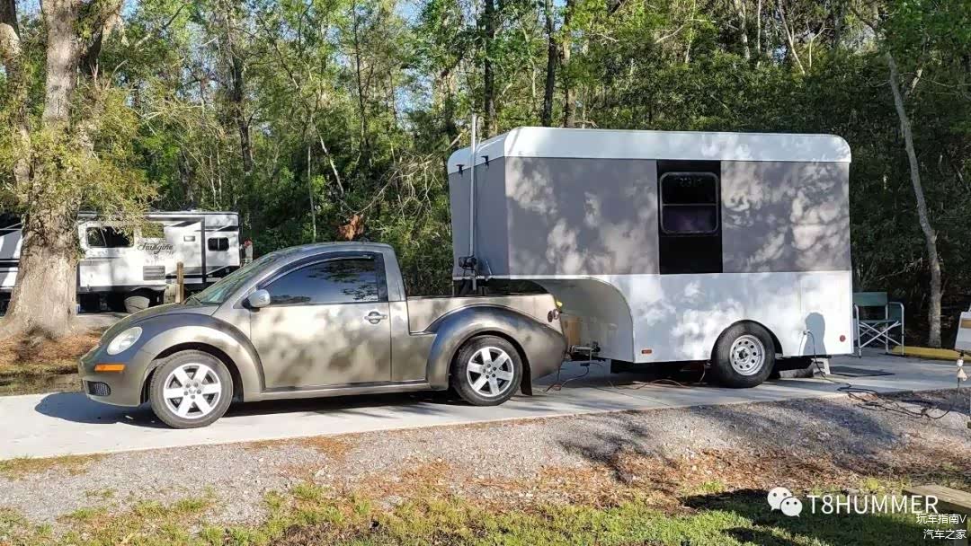首先,后轮悬挂换成了空气避震,其次,车主使用了升降式的半挂房车,在移动时将“房顶”降下来,与甲壳虫保持相等的高度。