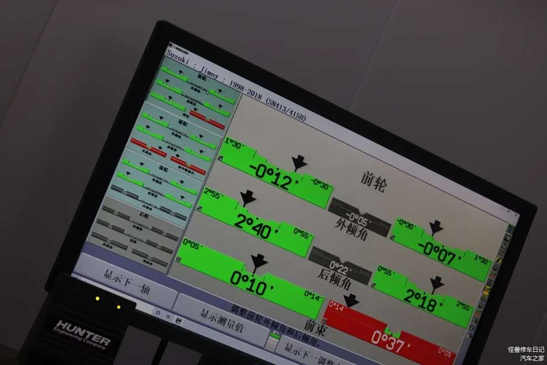 底盘没啥配件要更新的,3万多公里,部件状态都很好。我们把轮胎装车后,就直接通过四轮定位调整一下底盘数据即可,因为车主说这车有跑偏现象,所以我们采用美国HUNTER定位仪对底盘各倾角数值做一下测量校正。