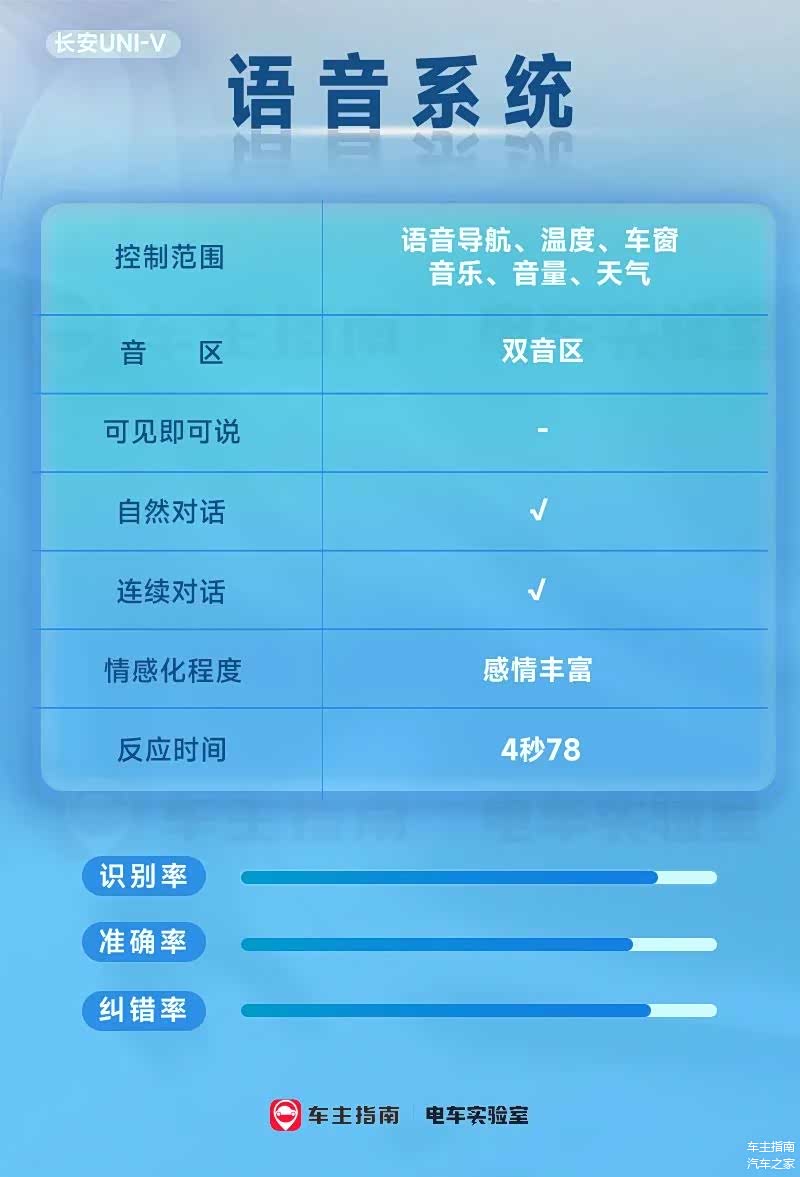 实际体验上,给了我不少惊喜,不仅功能上能完美实现基础的语音导航、温度、车窗、音乐、音量、天气等,还拥有自定义唤醒词、连续对话、自然对话、上下文识别、跨场景识别以及自定义指令等;对于识别率+纠错等能力的测试,UNI-V同样有着不俗的表现。