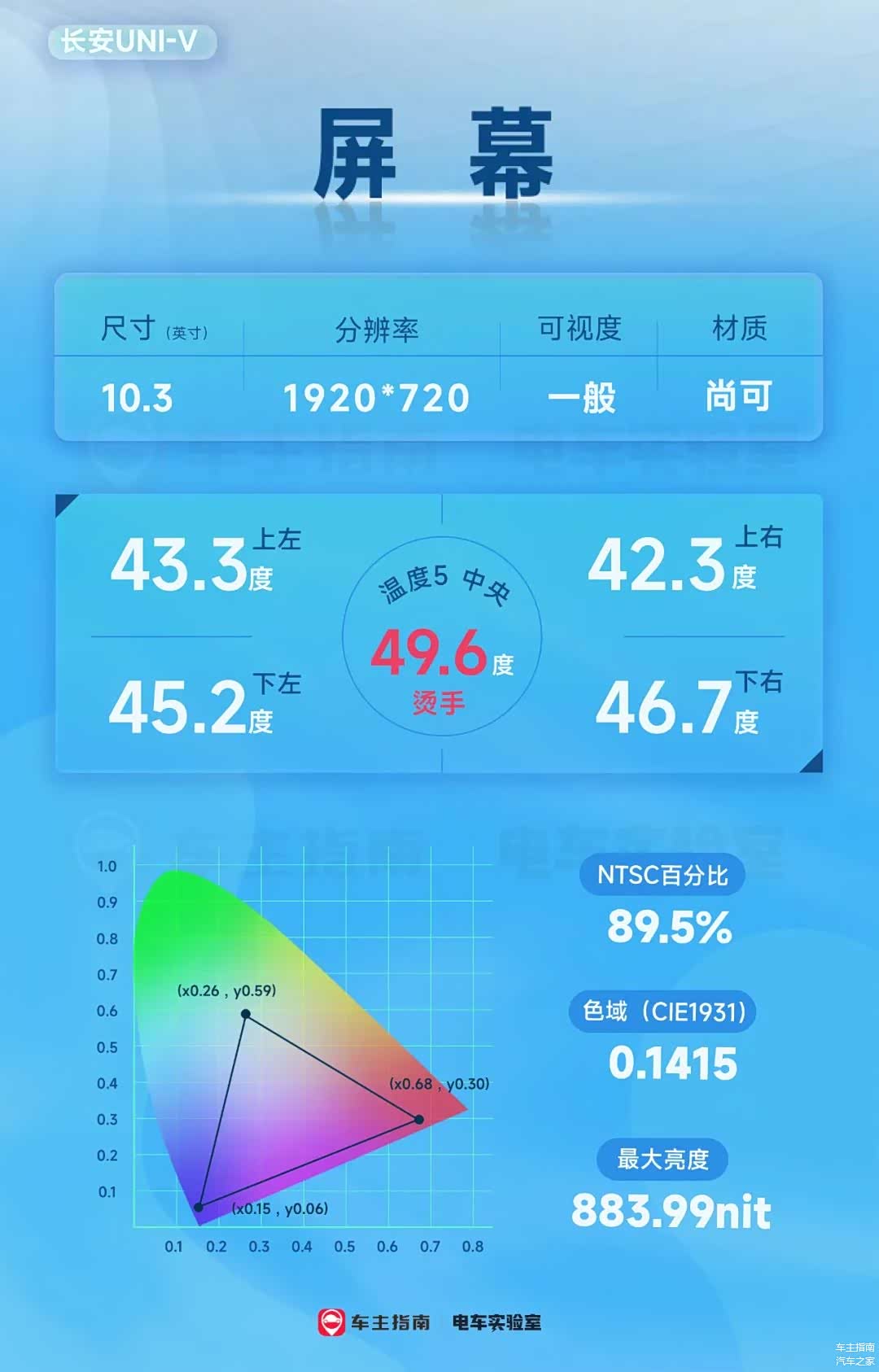 在“第一眼的”屏幕表现上,UNI-V的10.3英寸中控屏采用了天马专属定制的TM103XDHP95 TFT-LCD屏幕,分辨率1920*720,响应时间40ms,而实测PPI达到了199(RGB标准排列),NTCS色域89.5%,峰值亮度达到883.99nit,最低亮度0.71 nit,表现属于优秀水平。