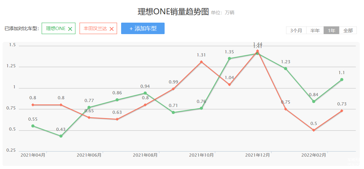 另外,理想ONE和汉兰达的销量,也相当胶着。此前,理想ONE已经多次在单月销量上超过汉兰达,显然它已经成为丰田无法忽视的对手。