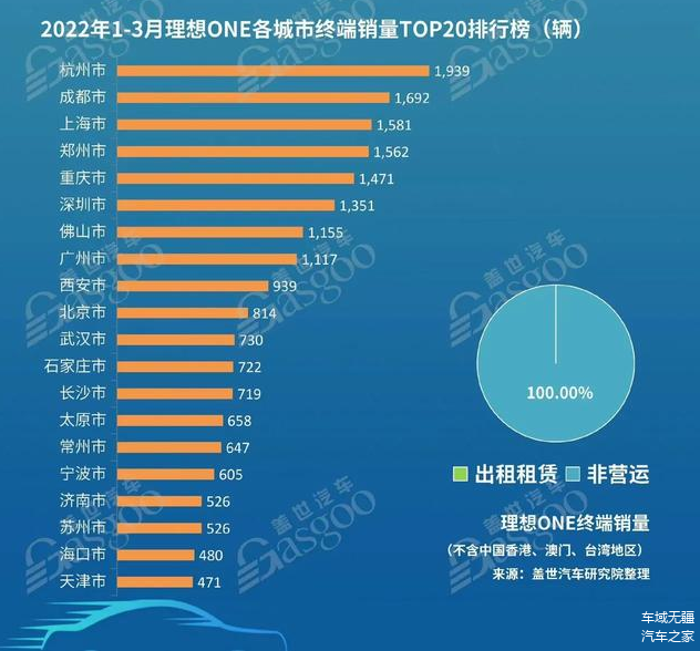 而根据最近盖世汽车发布的数据显示,今年1-3月份,理想ONE在杭州的销量最好,近2千辆。随后是成都、上海、郑州、重庆,都有近1500辆的终端销量。由此可见,理想ONE的目标客户群体主要分布在一二线城市。