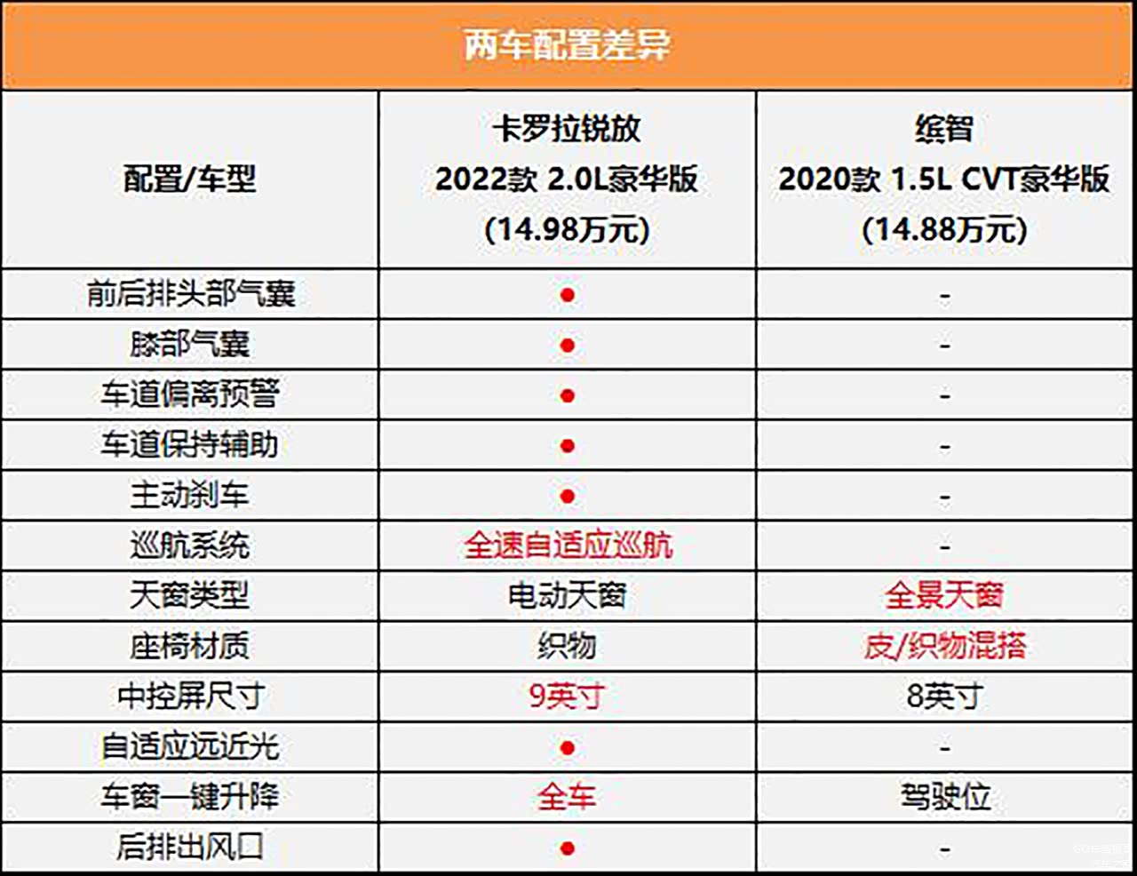公平起见,我们选用指导价接近的卡罗拉锐放 2022款 2.0L豪华版(14.98万元)和缤智2020款 1.5L CVT豪华版(14.88万元)进行对比,都是豪华版,看看谁的配置更丰富。