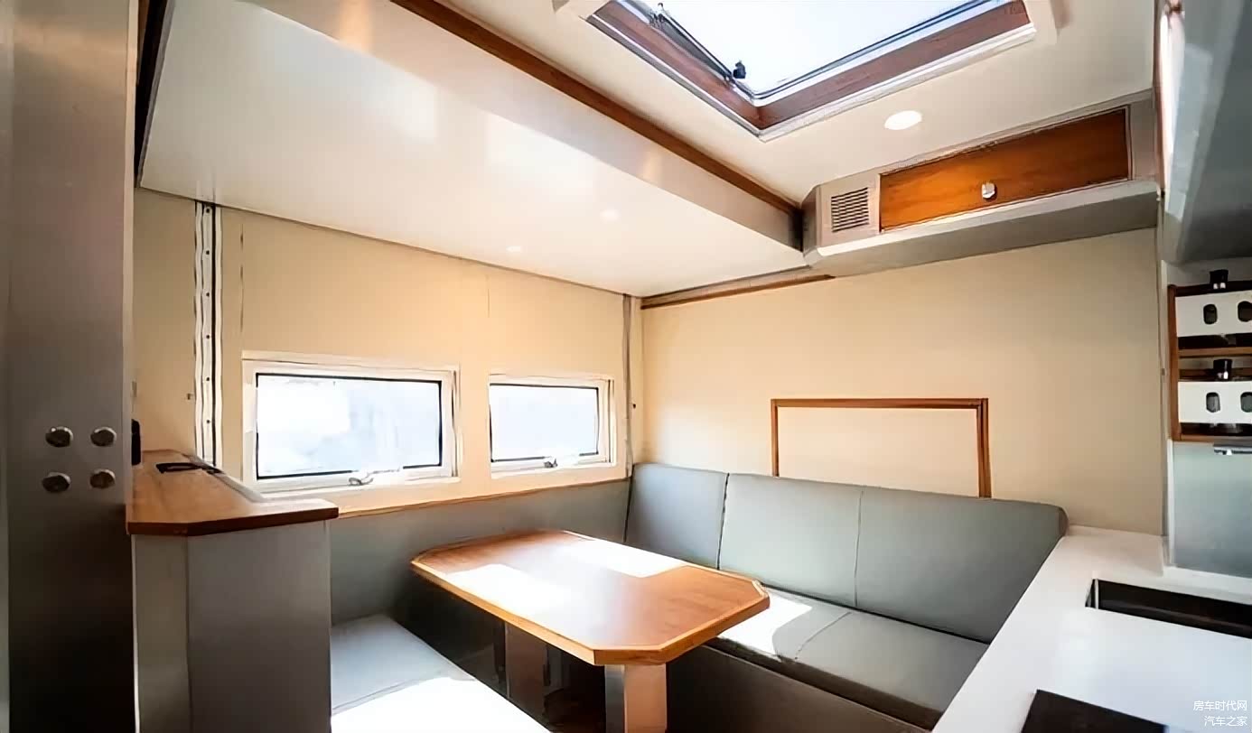 车厢的前部为会客区,采用了经典的对座沙发+升降桌面的布局,得益于重卡房车的内部大空间,坐在会客区腿部可以舒适地摆放,不会有憋屈感。会客区的顶部开设有一扇天窗,配合车厢左右两侧的窗户,在晴天状态下,车内拥有足够的自然光保障内部的通透明亮。娱乐方面,穿越者S为车友们提供了挂壁式液晶电视和音响,方便和家人朋友一起享受房车快乐时光。