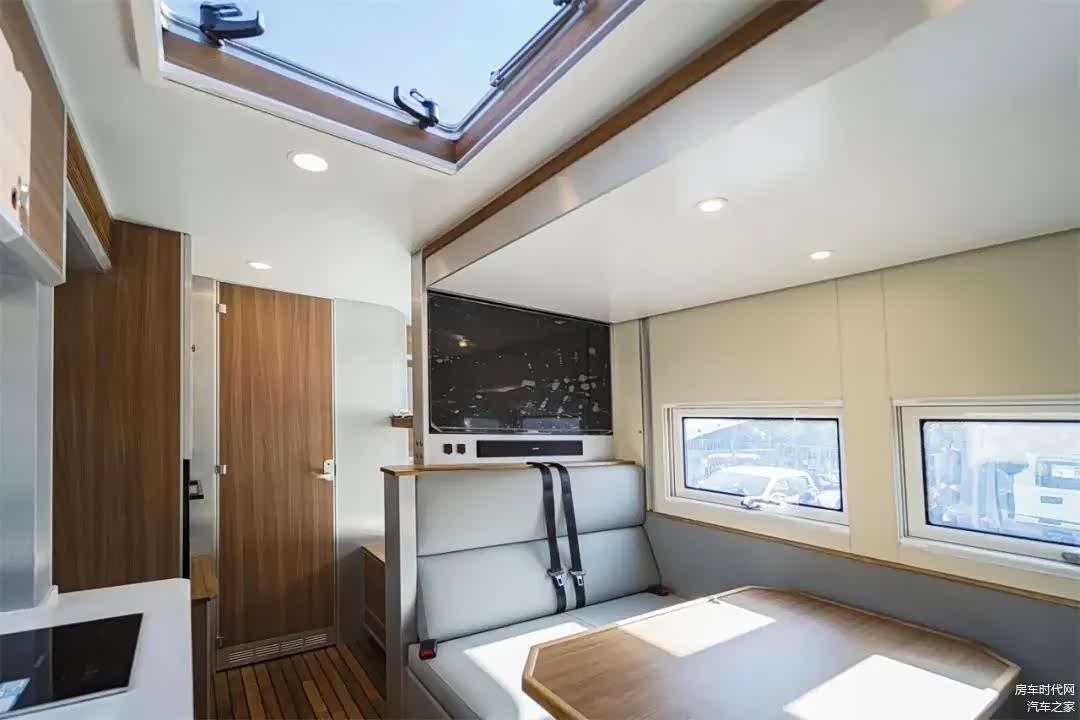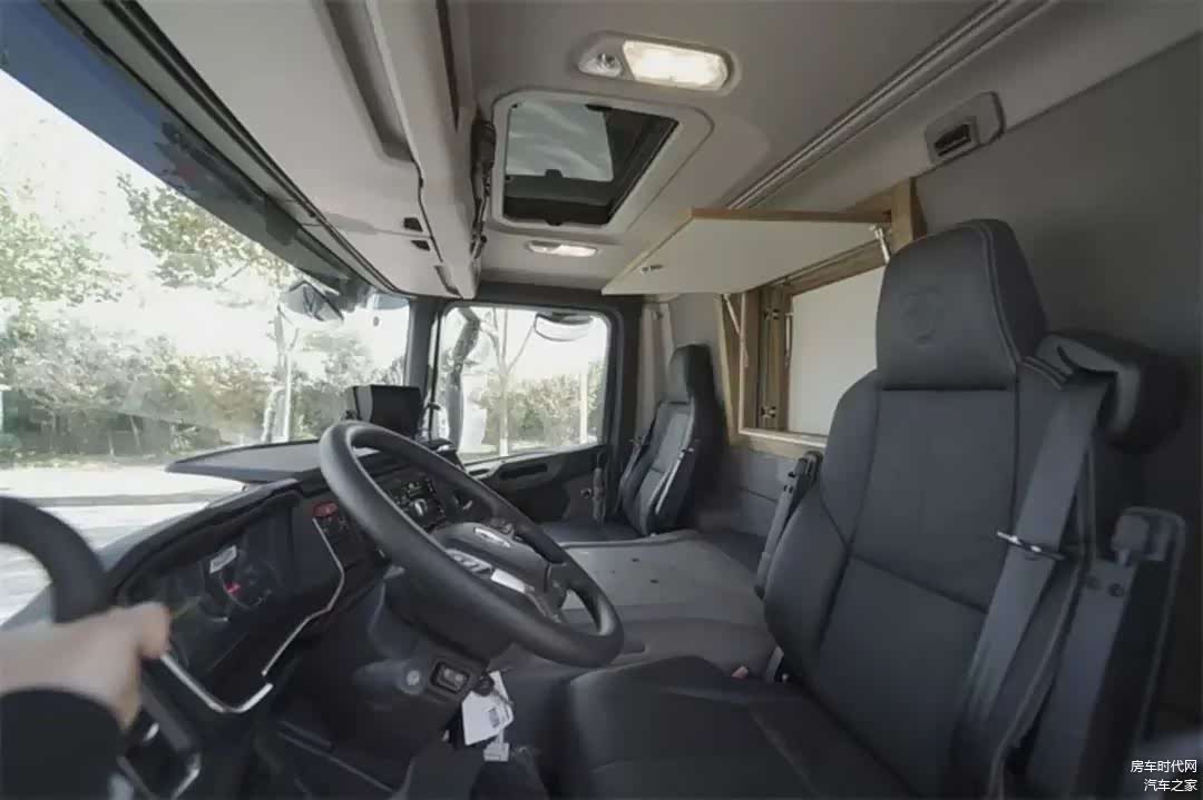 中门进入车内,主副驾驶座椅为气动悬置座椅,具有可调减震和座椅加热功能,还配置了360度安防监控保障车友们的用车安全。驾驶区与后方生活区之间有一个窗口,方便前后的交流。