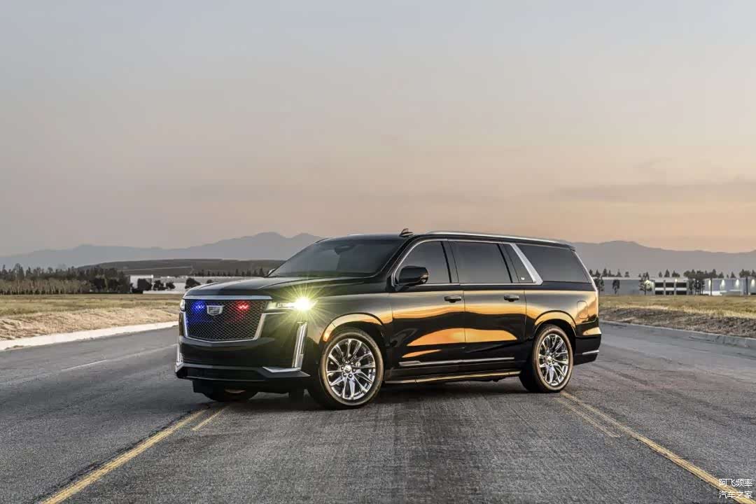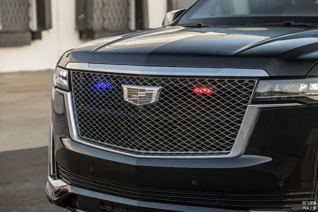 从外观上来看,这款 SUV 看起来就是标准版的凯迪拉克Escalade,除了车窗上的浓重的黑色、更低的车身姿态和前进气格栅上的额外的警示灯光。