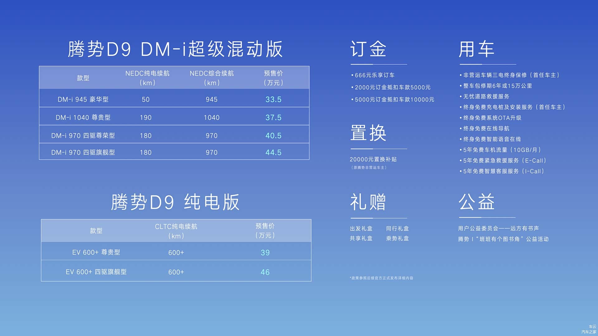 包含DM-i和纯电两个动力版本的 腾势D9(图片 | 参数 | 询价),最终的预售价被定格在了33.5万元~46万元之内,另外还有预售价为66万元、限量发售99台的创始版车型。