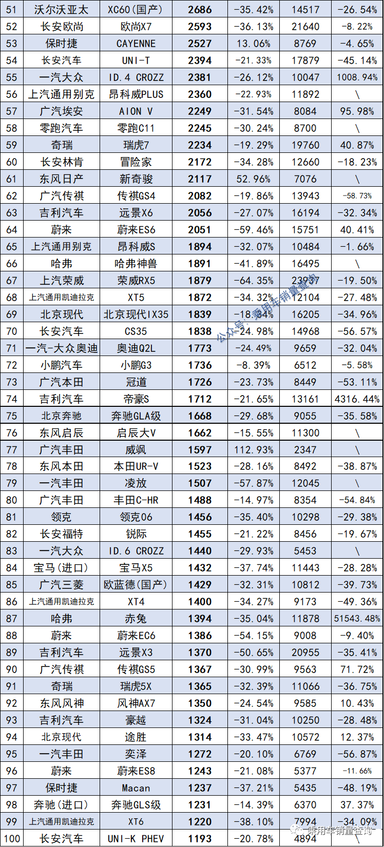 排行榜常见销量不错的车型,4月份销量下滑严重,比如自主品牌,红旗HS5销量为5751辆,星越L销量为5067辆,欧尚X5销量为4941辆,瑞虎8销量为4675辆,博越销量为3814辆,捷途X70销量为2898辆,传祺GS4销量为2082辆,荣威RX5销量为1879辆。以上车型以前都是万辆俱乐部会员,4月表现一般,跌出了万辆俱乐部。
