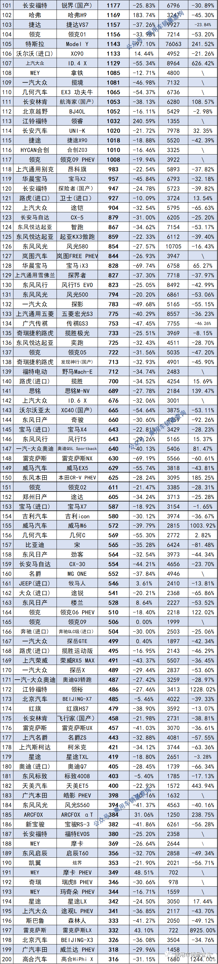 其它车型具体销量请看下表,也欢迎大家评论区留言互动。