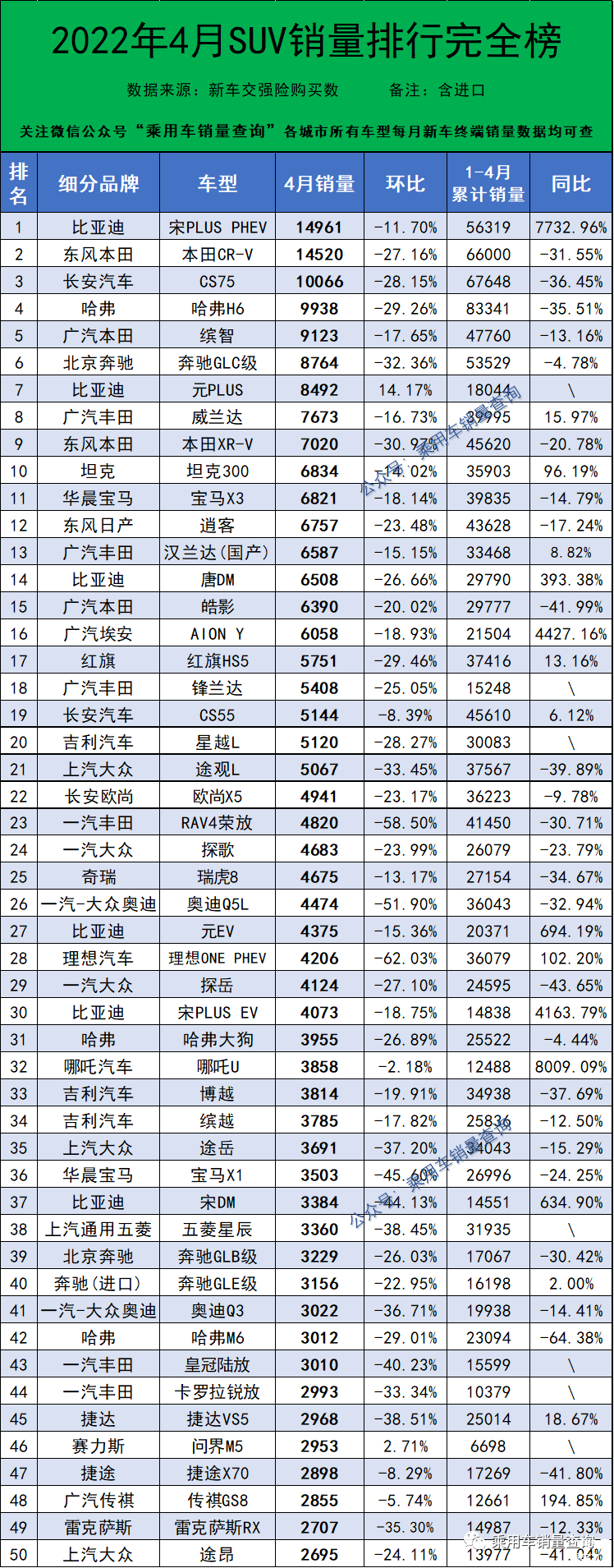 附:2022年4月份SUV销量排行榜完整版