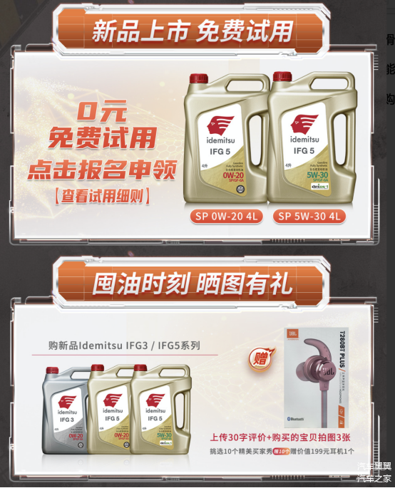 出光润滑油上市的IFG5系列新品包含IFG5 0W-20 SP/GF-6A,IFG5 5W-30 SP/GF-6Adexos1 Gen2。这个系列的产品是经过日本百年配方研制而成,并且可以对发动机做到更加精准的维护。根据不同的行车状况,五大保护可以和谐组合,充分发挥发动机性能,有效减少摩擦,降低动力损失,同时让发动机的性能有所提升,进而加速更有力。耐磨性超过GF-6标准,优异的高温清净性使用起来更加安心。低灰分配方能有效减少国六车辆颗粒捕集器堵塞,无论你是何种车型都能够享受出光润滑油带来的优秀品质。